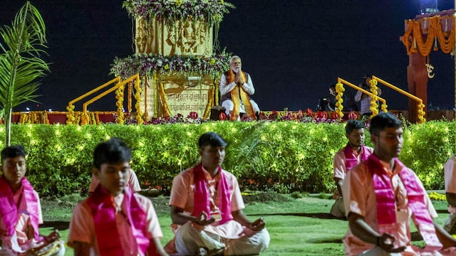 Prime Minister Narendra Modi’s Somnath visit during the Somnath Swabhiman Parv included formal programmes, tributes, prayers and a massive drone show. Here are some highlights from his visit to Gujarat. (Image: PTI)